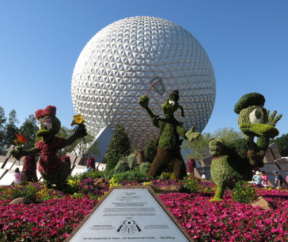 Um parque futurista dividido em duas áreas: Future World, com atrações tecnológicas como Spaceship Earth, Soarin, Mission: SPACE e Test Track; e World Showcase, uma área com pavilhões que representam diferentes países, onde se pode experimentar culinárias e culturas variadas.