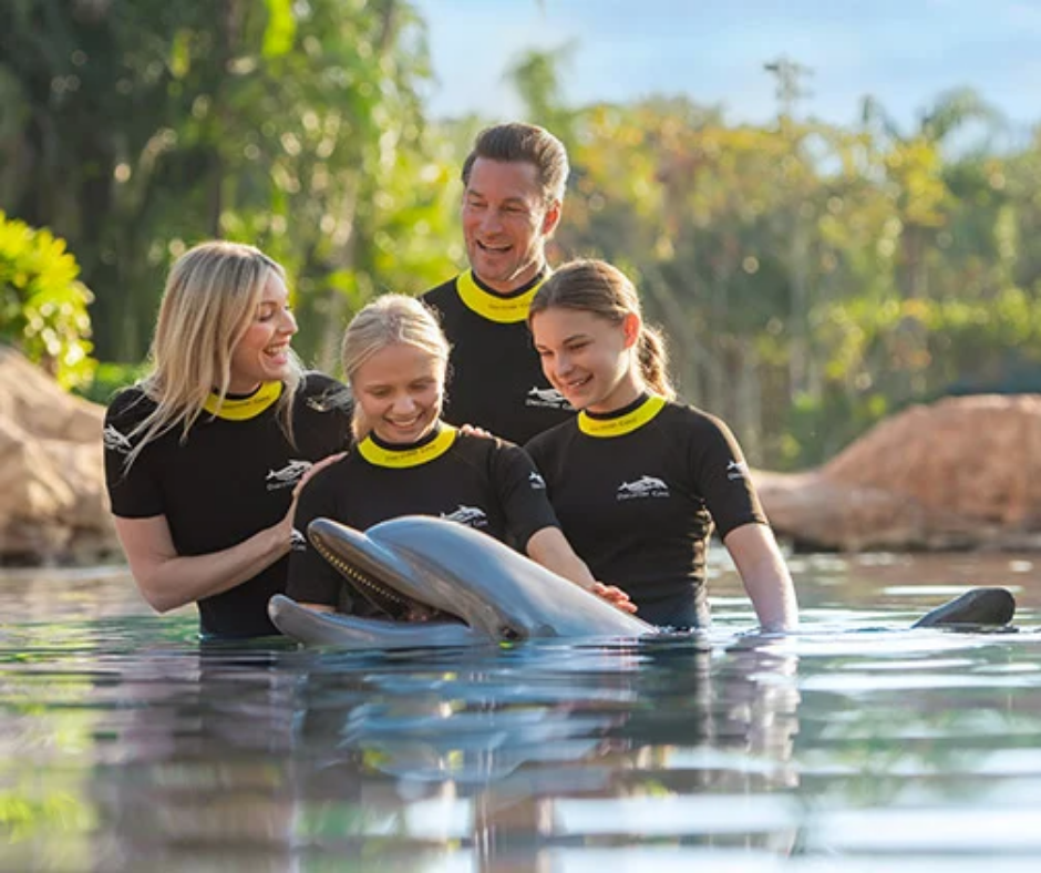 Os visitantes podem nadar com golfinhos, alimentar arraias e peixes tropicais, além de relaxar em praias artificiais e rios tranquilos.