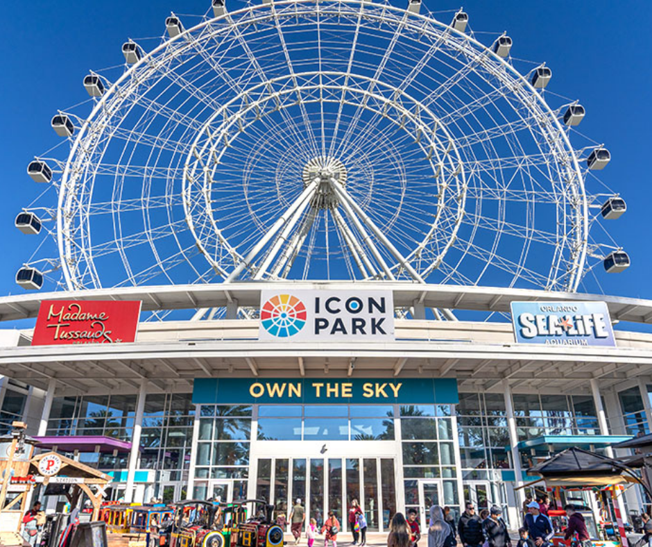 Área de entretenimento ao ar livre com a famosa roda-gigante The Wheel, restaurantes, lojas e atrações como museus interativos e simuladores, ideal para lazer e vistas panorâmicas da cidade.